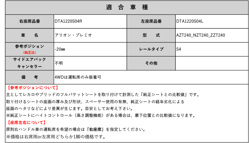 [レカロ RS-G/TS-G/SP-G]AZT_NZT_ZZT240 アリオン・プレミオ 用シートレール(4ポジション)[N SPORT製][保安基準適合]
